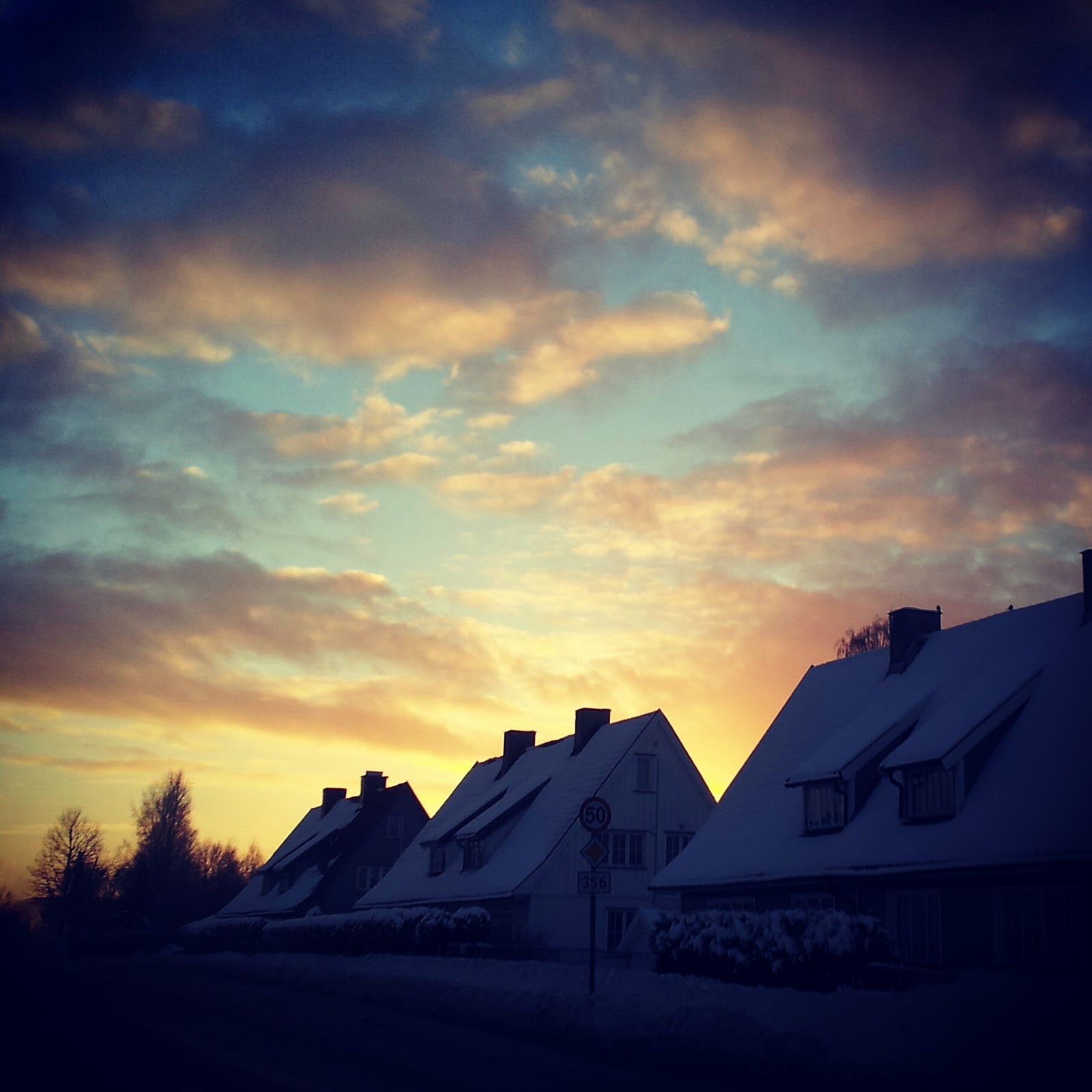 En liten tur ut i vinterlandskapet. En stille kirkegård. Snøkledde pepperkakehus. Rundkjøring i solnedgang. Og selvfølgelig en kaffestopp på veien. Deilig!